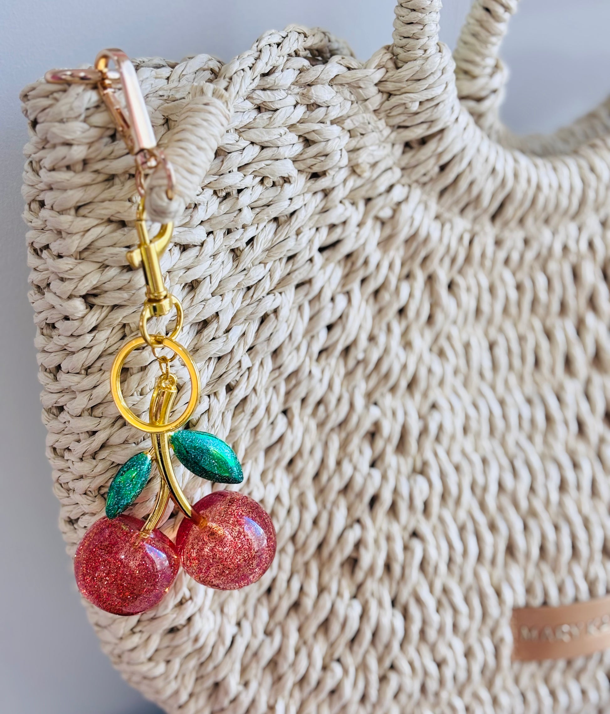Llavero de cerezas brillantes con detalles dorados, ideal para bolso o llaves. Chic, divertido y lleno de estilo.
