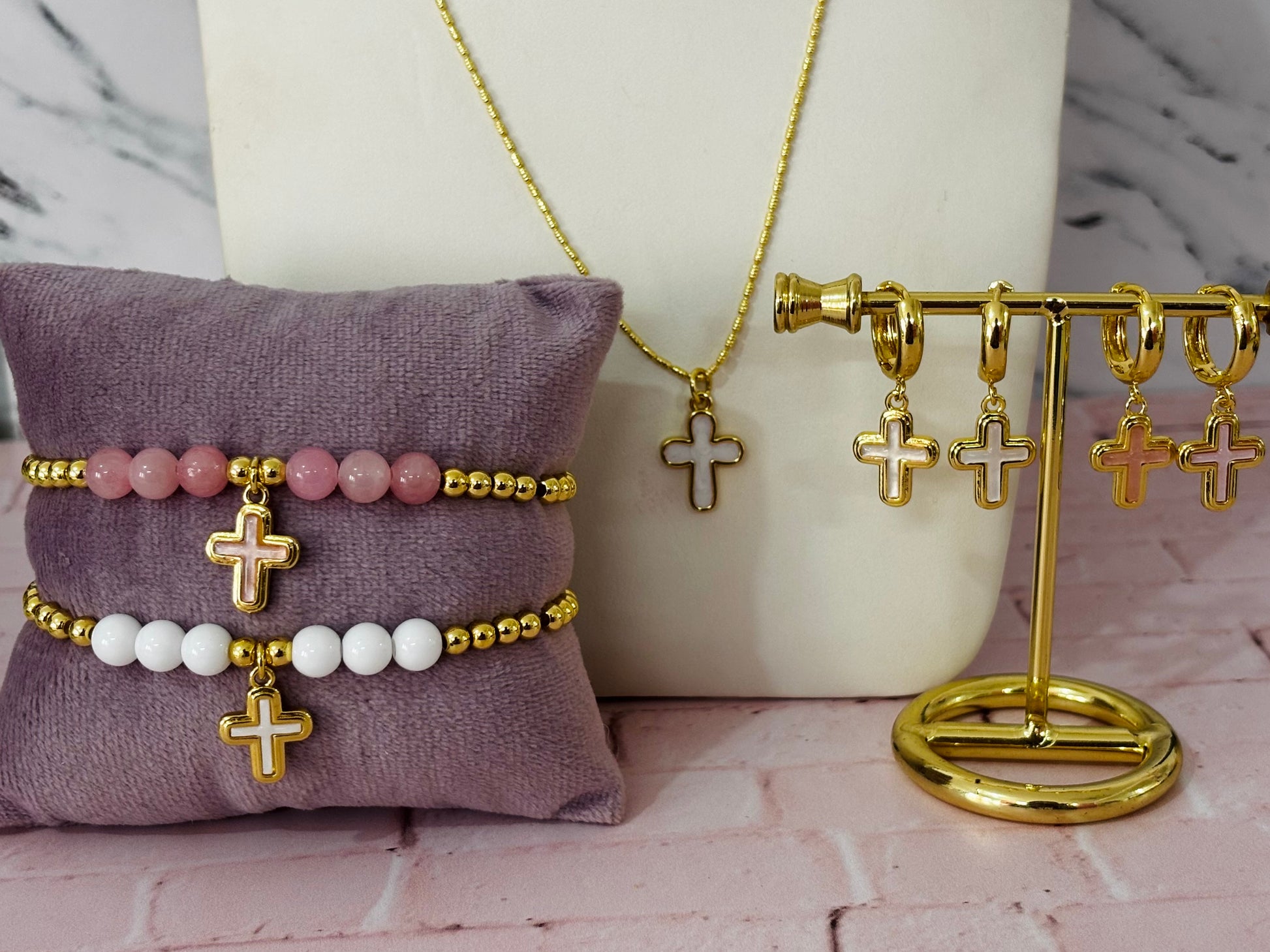 Huggies de chapa dorada con dije de cruz blanca. Delicados y combinables, ideales para uso diario y reventa. Envíos a México.