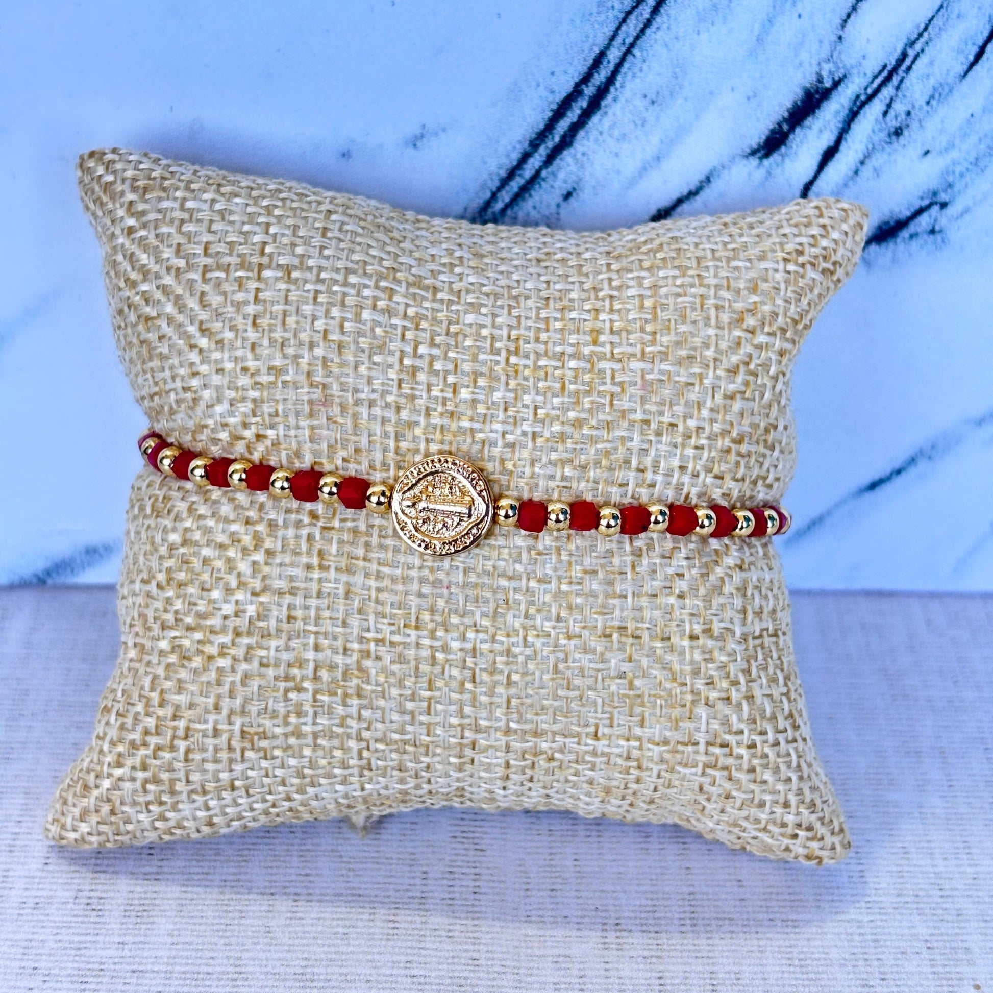 HERMOSA PULSERA AJUSTABLE CON HILO Y CUENTAS ROJAS, CONLA MEDALLA DE SAN BENITO. PROTECCION Y FUERZA.